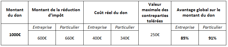 Les dons effectués en notre faveur vous permettent de bénéficier d’une réduction d’impôt égale à 66% du montant du don pour les particuliers et à 60% pour les entreprises. Le bénéficiaire peut vous offrir des contreparties dans la limite de 25% du montant du don. Soit un avantage global maximal de 85%.